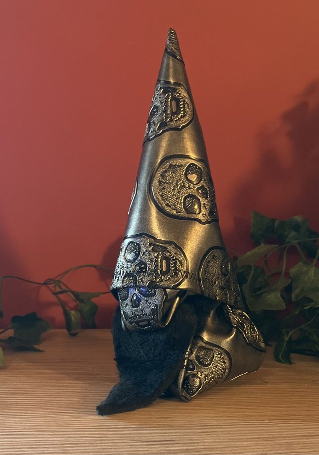 Son chapeaux, son corps et son petit nez sont en simili argenté avec des motifs skull et sa barbe en polaire oeko-tex noire.