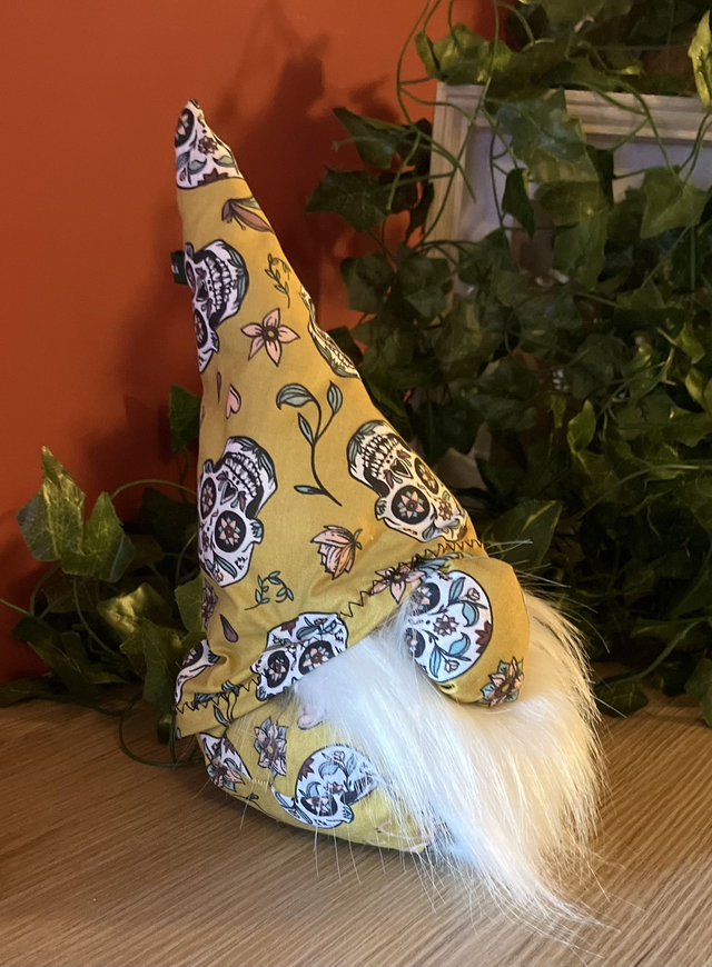 Tout vêtu en tissu oeko-tex imprimé "calavera" sur un fond jaune et sa barbe en fausse fourrure blanche.